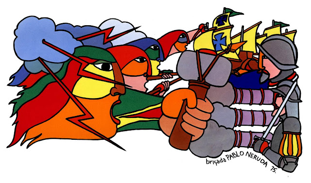 Con los murales empezamos en el año 68 con un grupo de 7 chicos. Todos éramos muy jóvenes entre 14 y 17 años, todos menores de edad. En una marcha que se hizo en Chile entre la ciudad Valparaíso, que era el puerto principal en ese tiempo, y Santiago (son más o menos 120 kilometros) pintamos los muros... pero no teníamos dinero entonces la pintura teníamos que inventarla. La hicimos con una mezcla de aceite quemado de las autos, alquitran liquido y el grudo que era una cola que se hace con agua y harina. Esta fue nuestra primera salida en absoluto. Después, cuando tuvo lugar la campaña electoral para las elecciones presidenciales de 1970, este grupo se unió a la campaña presidencial de Allende y luego creamos otro grupo muralista llamado Brigada Ramona Parra en recuerdo de una obrera textil matada durante una huelga. Seguimos creando grupos por todo Chile, aproximadamente 90, que hacían propaganda electoral. Después, cuando empezamos a hacer diseños tuvimos un problema: no teníamos historias sobre todo porque nuestros ancestros, los mapuches o los araucanos, que estaban ya cuando llegaron los españoles a Sur América, tenían formas de arte mientras los españoles eran esencialmente guerreros con una sociedad matriarcal donde las mujeres eran las jefas y los hombres hacían la guerra entonces no teníamos fundamentos. ¿Qué hicimos? Fuimos a buscar a los Incas, a los Aztecas, a los grandes muralistas mexicanoscomo Diego Rivera, y copiamos. De hecho si tú ves esta técnica de agregar el negro, nosotros no la inventamos...